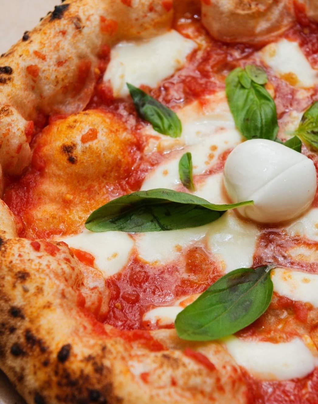 « La pizza emblèmatique de la cuisine italienne, allie une croûte fine et croustillante à une généreuse couche de sauce tomate, de mozzarella fondante et de basilic frais. »